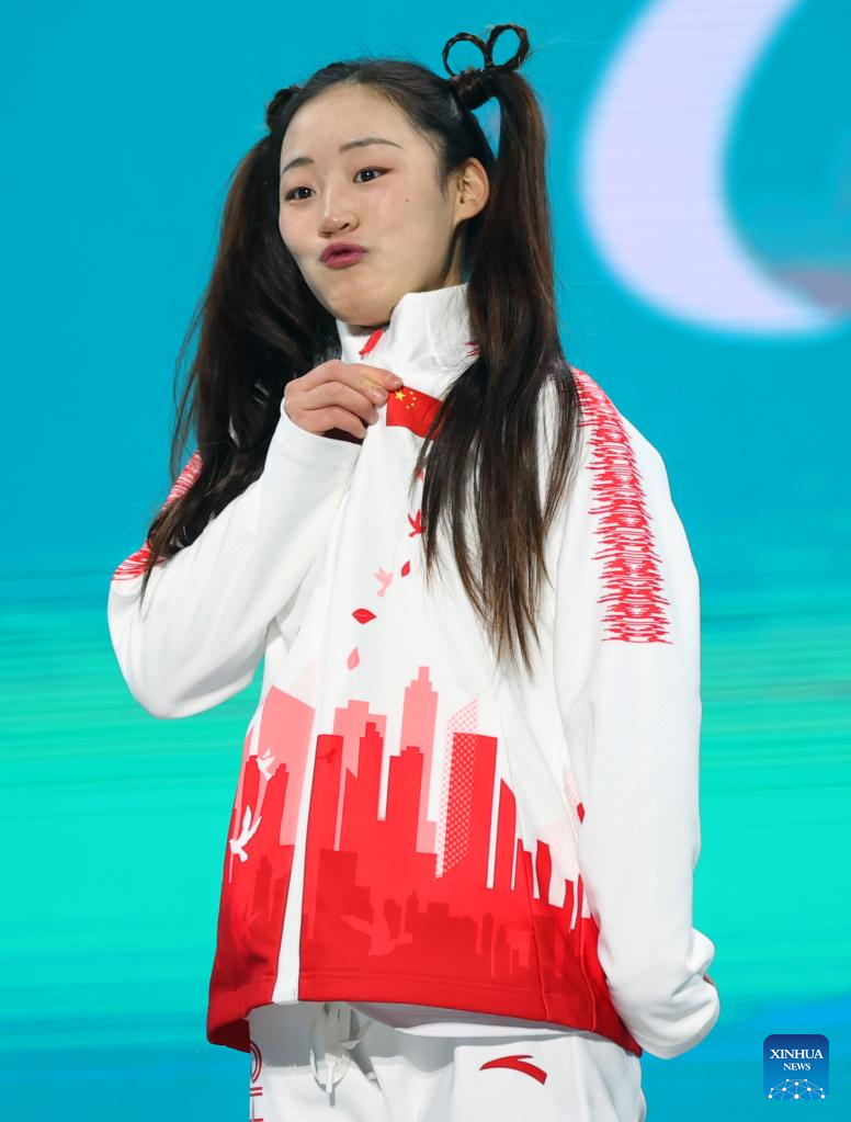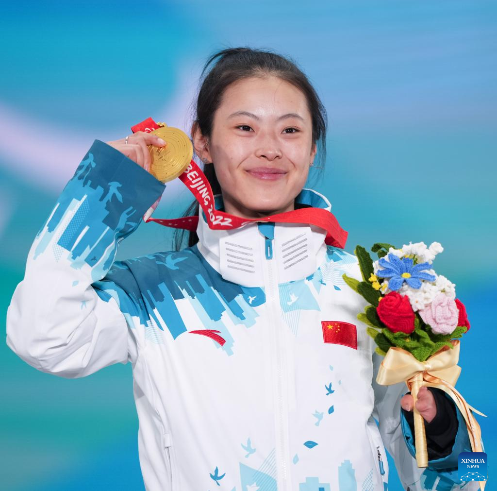 Gold medalist Guo Yujie of China poses for a photo during the awarding ceremony of Para Biathlon Women's Sprint Standing of Beijing 2022 Paralympic Winter Games at Zhangjiakou Medals Plaza in Zhangjiakou, north China's Hebei Province, March 6, 2022. (Xinhua/Jia Haocheng)