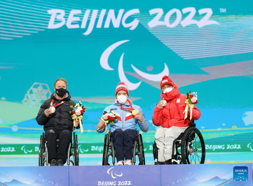 Gold medalist Jesper Pedersen of Norway(C), silver medalist Corey Peters of New Zealand(L) and bronze medalist Morii Taiki of Japan pose for photo during the awarding ceremony for the Alpine Skiing Men's Super-G Sitting of Beijing 2022 Paralympic Winter Games at Yanqing Medals Plaza of the Winter Paralympics in Yanqing District, Beijing, capital of China, March 6, 2022. (Xinhua/Luo Yuan)