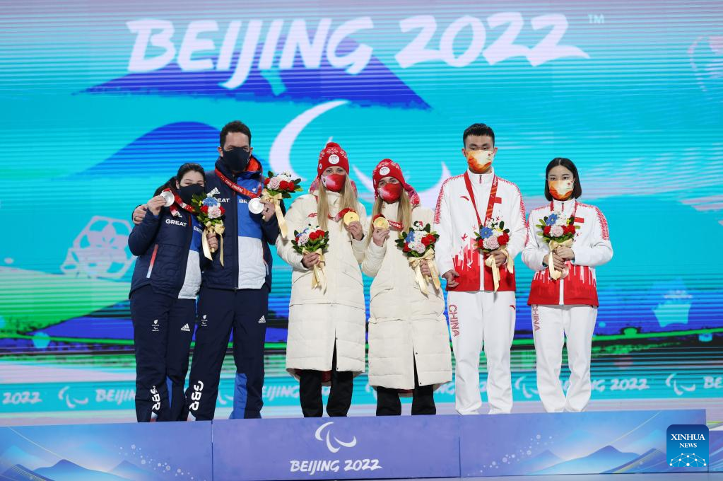 Medalists and their guides pose for a group photo during the awarding ceremony for the Alpine Skiing Women's Super-G Vision Impaired of Beijing 2022 Paralympic Winter Games at Yanqing Medals Plaza of the Winter Paralympics in Yanqing District, Beijing, capital of China, March 6, 2022. (Xinhua/Luo Yuan)