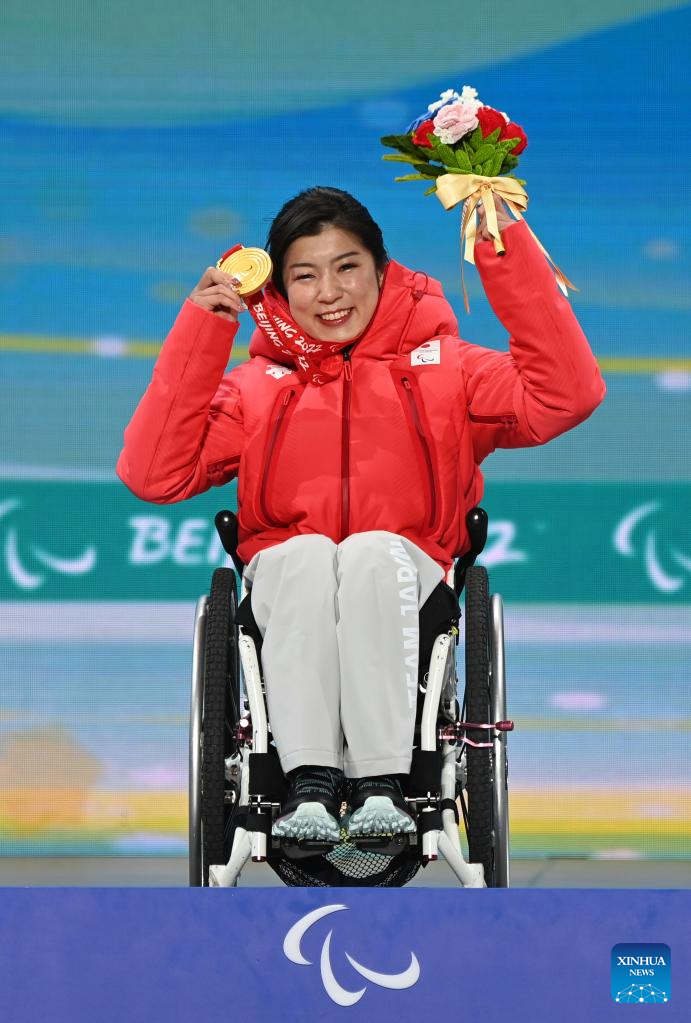 Gold medalist Muraoka Momoka of Japan shows her medal during the awarding ceremony for the Alpine Skiing Women's Super-G Sitting of Beijing 2022 Paralympic Winter Games at Yanqing Medals Plaza of the Winter Paralympics in Yanqing District, Beijing, capital of China, March 6, 2022. (Xinhua/Li Jianan)