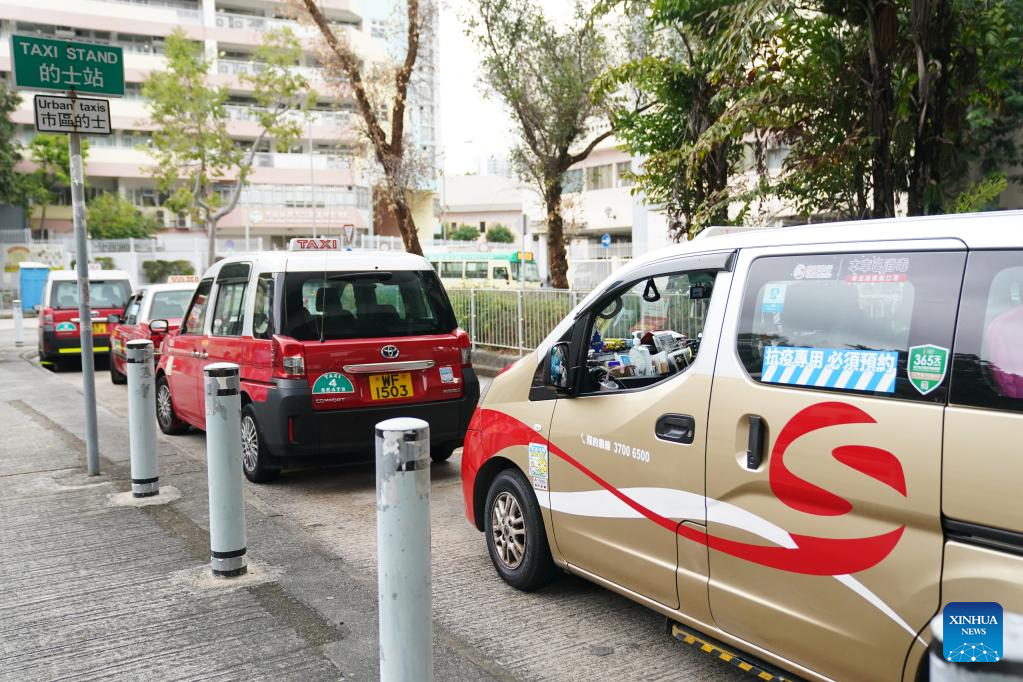 Taxies of the "anti-epidemic taxi" fleet stand by along a street in Hong Kong, south China, Feb. 18, 2022.(Xinhua/Wang Shen)