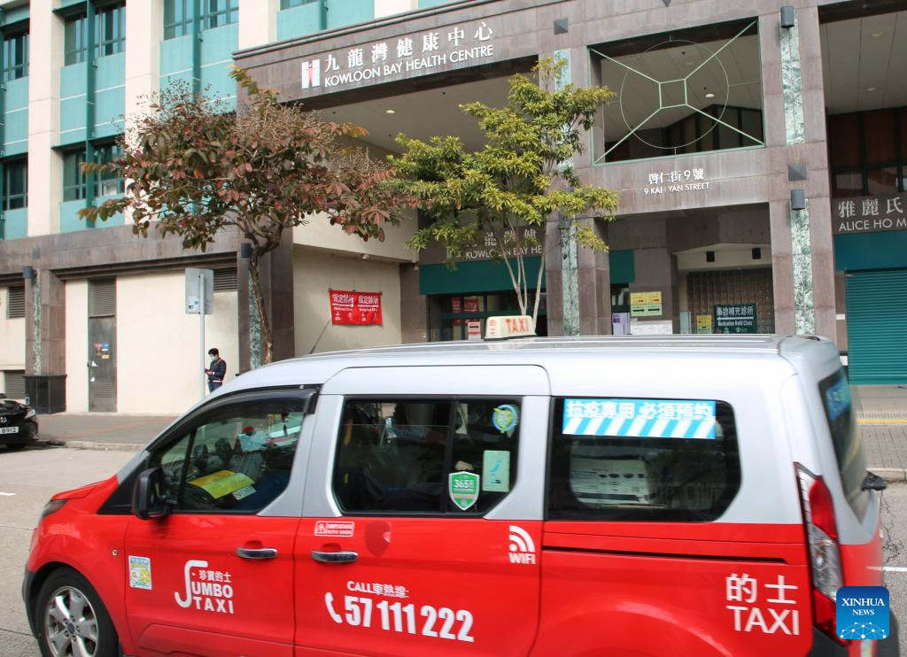 A taxi of the "anti-epidemic taxi" fleet picks up passengers in front of the Kowloon Bay Health Centre in Hong Kong, south China, Feb. 23, 2022.(Xinhua/Wan Houde)