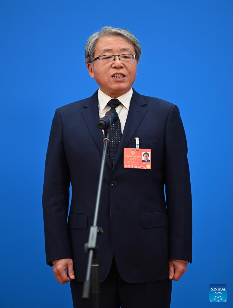 Wu Zhiliang, a member of the 13th National Committee of the Chinese People's Political Consultative Conference (CPPCC), attends an interview via video link ahead of the second plenary meeting of the fifth session of the 13th CPPCC National Committee at the Great Hall of the People in Beijing, capital of China, March 7, 2022. (Xinhua/Jin Liangkuai)