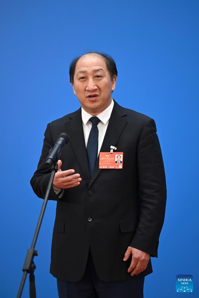 Sun Dehong, a member of the 13th National Committee of the Chinese People's Political Consultative Conference (CPPCC), attends an interview via video link ahead of the second plenary meeting of the fifth session of the 13th CPPCC National Committee at the Great Hall of the People in Beijing, capital of China, March 7, 2022. (Xinhua/Jin Liangkuai)