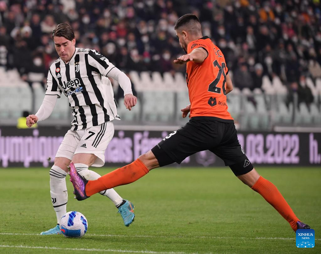 FC Juventus' Dusan Vlahovic (C) vies with Spezia's Dimitrios Nikolaou (L) and Martin Erlic during a Serie A football match between FC Juventus and Spezia in Turin, Italy, on March 6, 2022. (Photo by Federico Tardito/Xinhua)