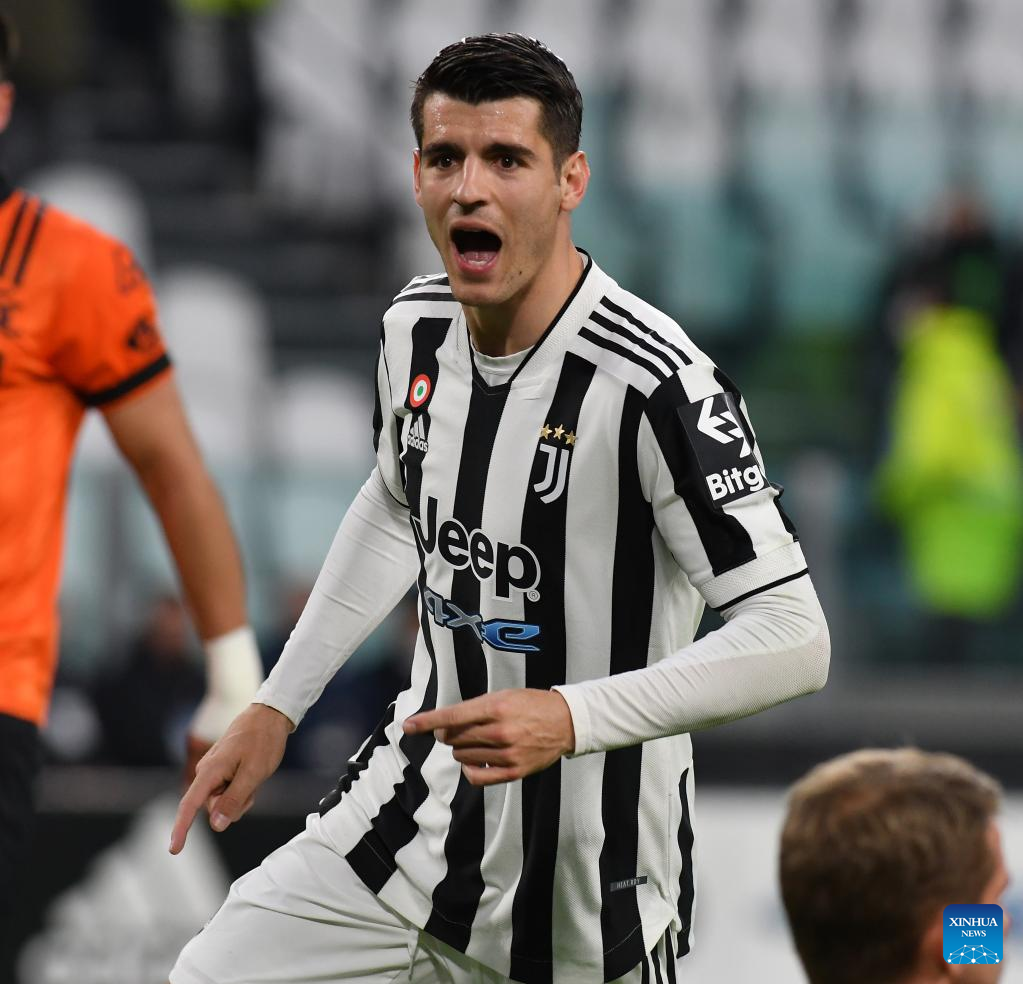 FC Juventus' Alvaro Morata celebrates his goal during a Serie A football match between FC Juventus and Spezia in Turin, Italy, on March 6, 2022. (Photo by Federico Tardito/Xinhua)