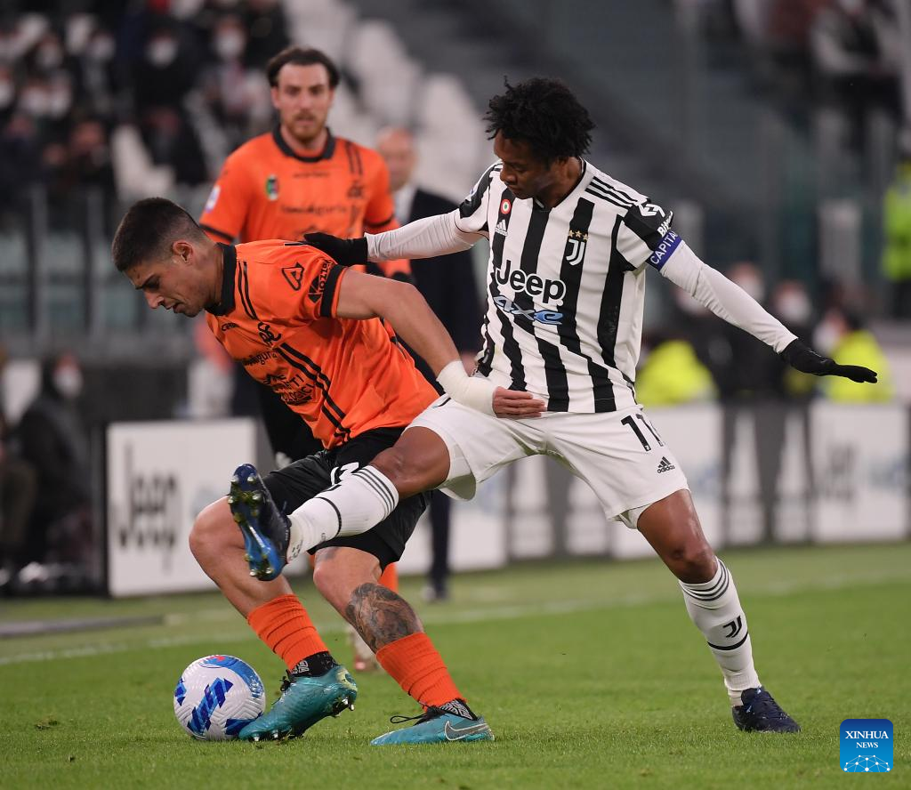 FC Juventus' Juan Cuadrado (R) vies with Spezia's Arkadiusz Reca during a Serie A football match between FC Juventus and Spezia in Turin, Italy, on March 6, 2022. (Photo by Federico Tardito/Xinhua)