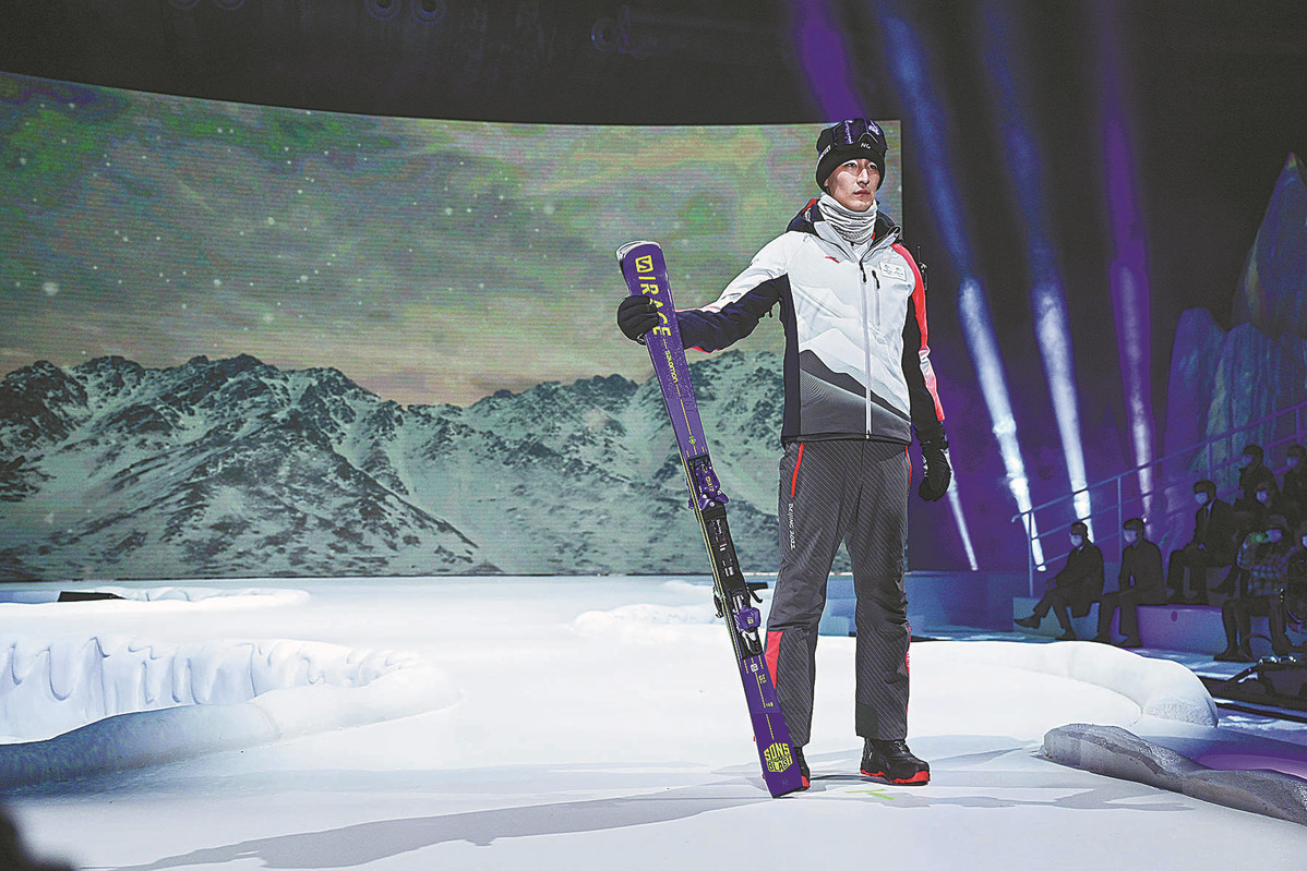 A model displays winter sports equipment and clothing for the 2022 Beijing Winter Olympic Games by Anta Sports at a show in October. CHINA DAILY