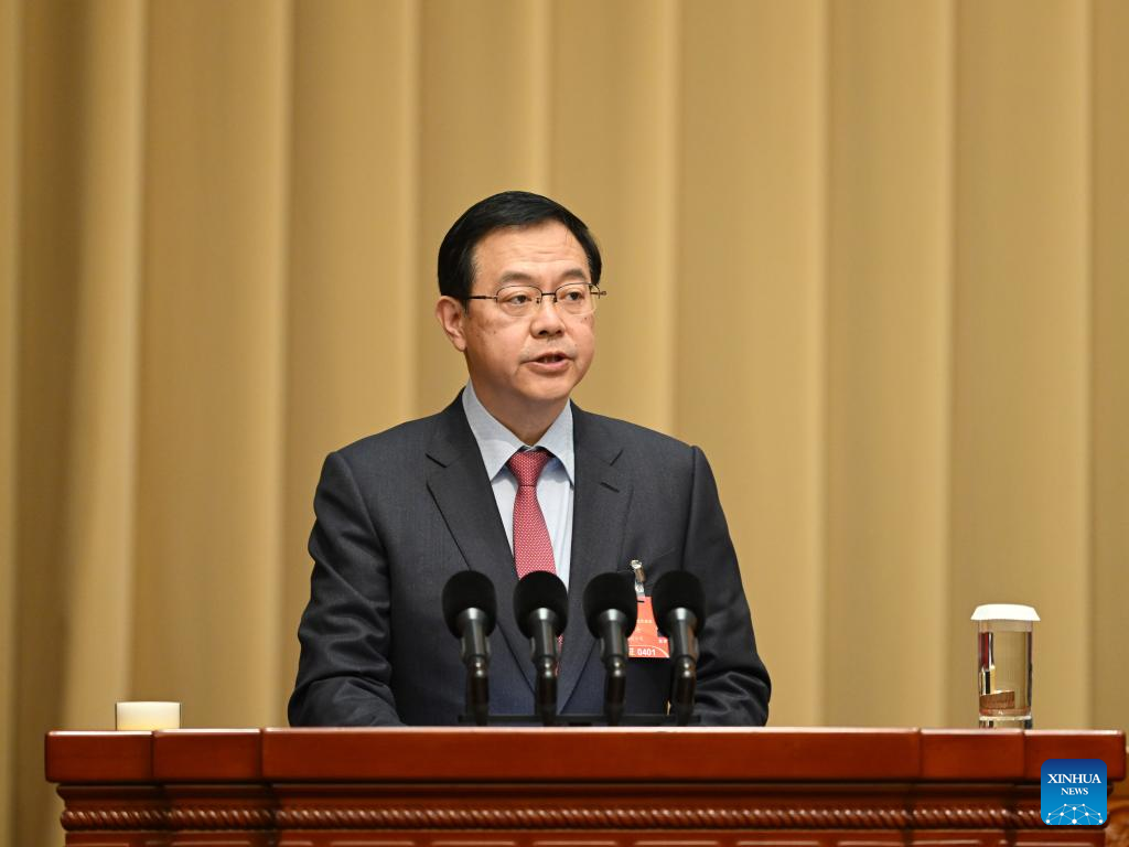 Li Daokui, a member of the 13th National Committee of the Chinese People's Political Consultative Conference (CPPCC), delivers a speech at the main venue of a video conference of the fifth session of the 13th CPPCC National Committee in Beijing, capital of China, March 7, 2022. (Xinhua/Yin Bogu)