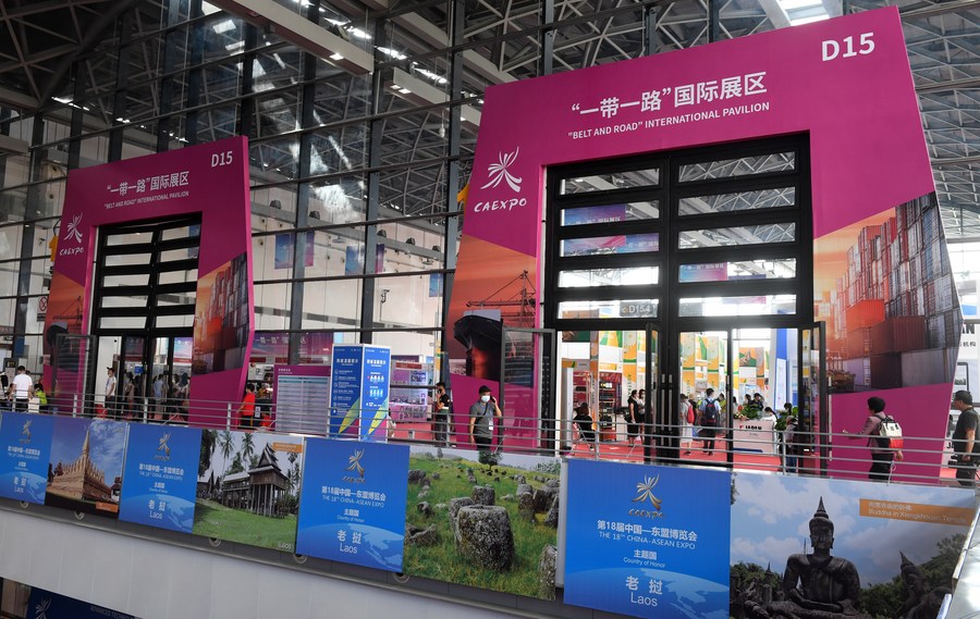 Photo taken on Sept. 11, 2021 shows the "Belt and Road" International Pavilion at the 18th China-ASEAN Expo in Nanning, south China's Guangxi Zhuang Autonomous Region. (Xinhua/Lu Boan)