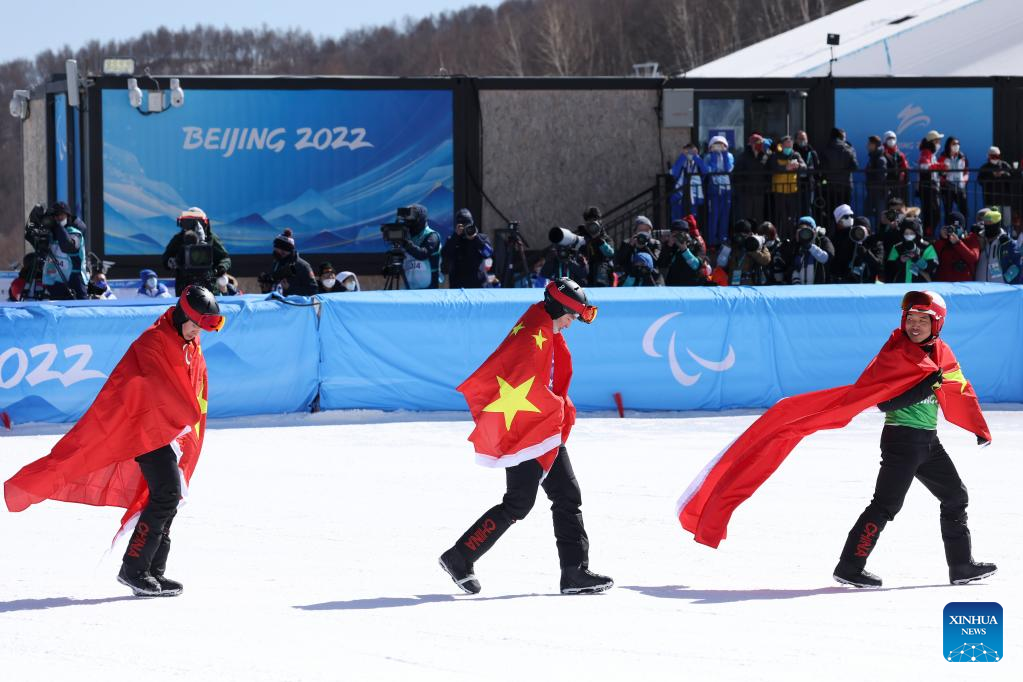 Ji Lijia (C), Wang Pengyao (L) and Zhu Yonggang of China celebrate after the Para Snowboard Men's Cross UL event of Beijing 2022 Winter Paralympic Games at Genting Snow Park in Zhangjiakou, north China's Hebei Province, March 7, 2022. (Xinhua/Mu Yu)