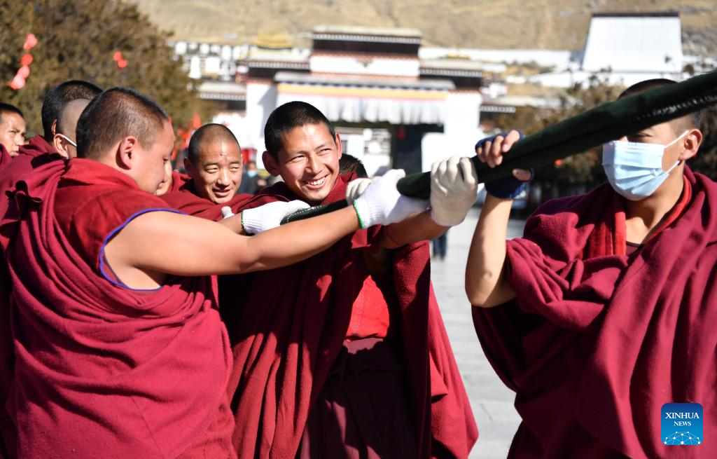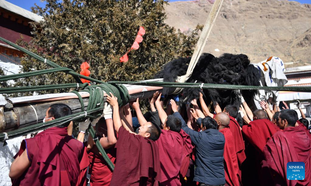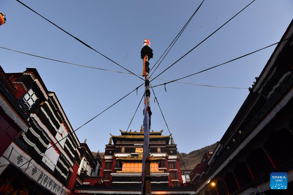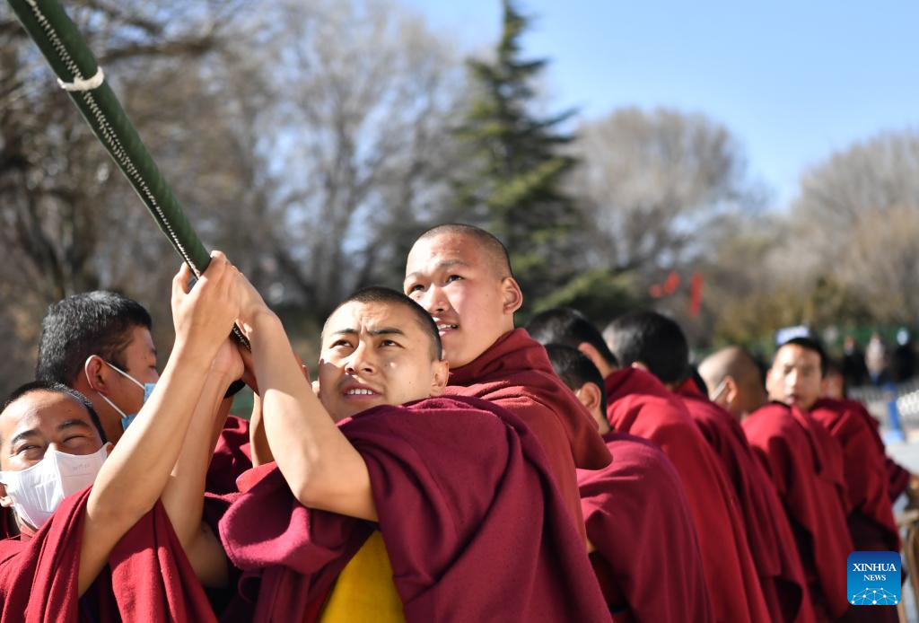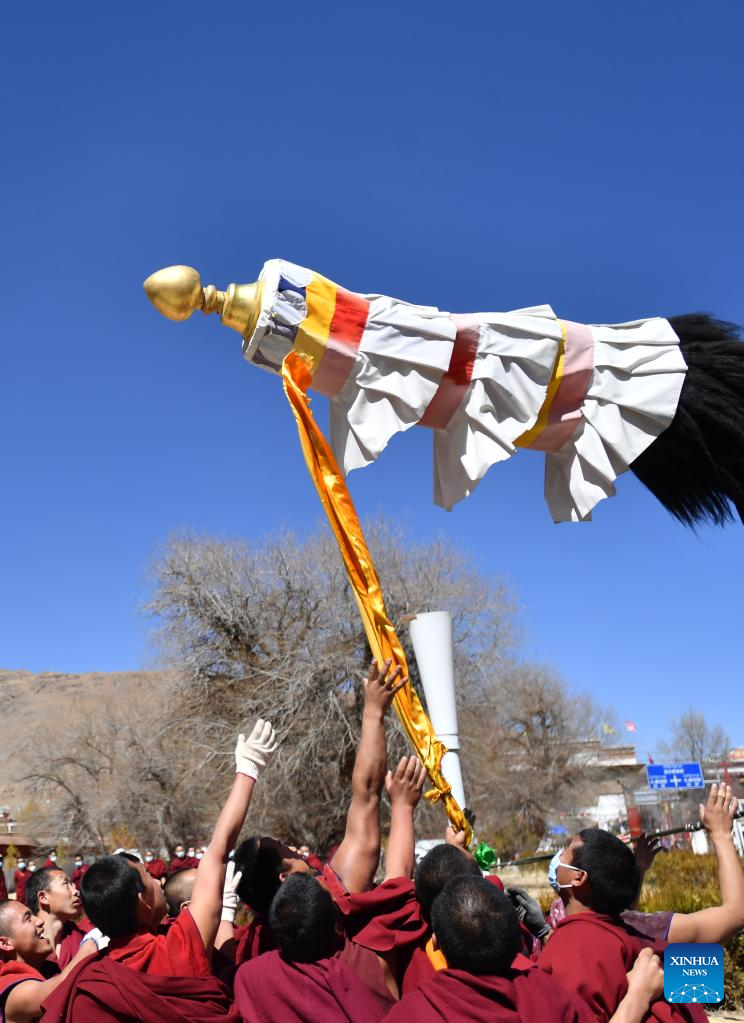 Monks set up a pole wrapped with prayer flags onto it during a ceremonial event at Tashilumpo Monastery in Xigaze City of southwest China's Tibet Autonomous Region, March 7, 2022. A ceremonial event was held at the monastery on Monday. (Xinhua/Chogo)