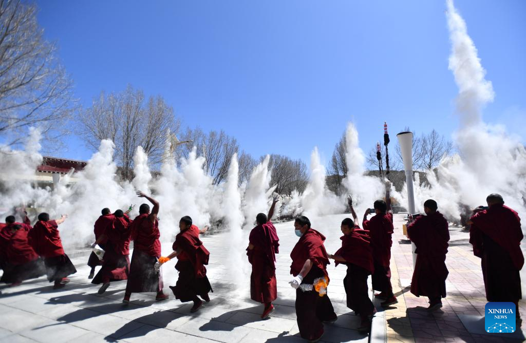 Monks throw zanba, a traditional Tibetan staple food made of roasted barley flour, into the sky to pray for good weather during a ceremonial event at Tashilumpo Monastery in Xigaze City of southwest China's Tibet Autonomous Region, March 7, 2022. A ceremonial event was held at the monastery on Monday. (Xinhua/Chogo)