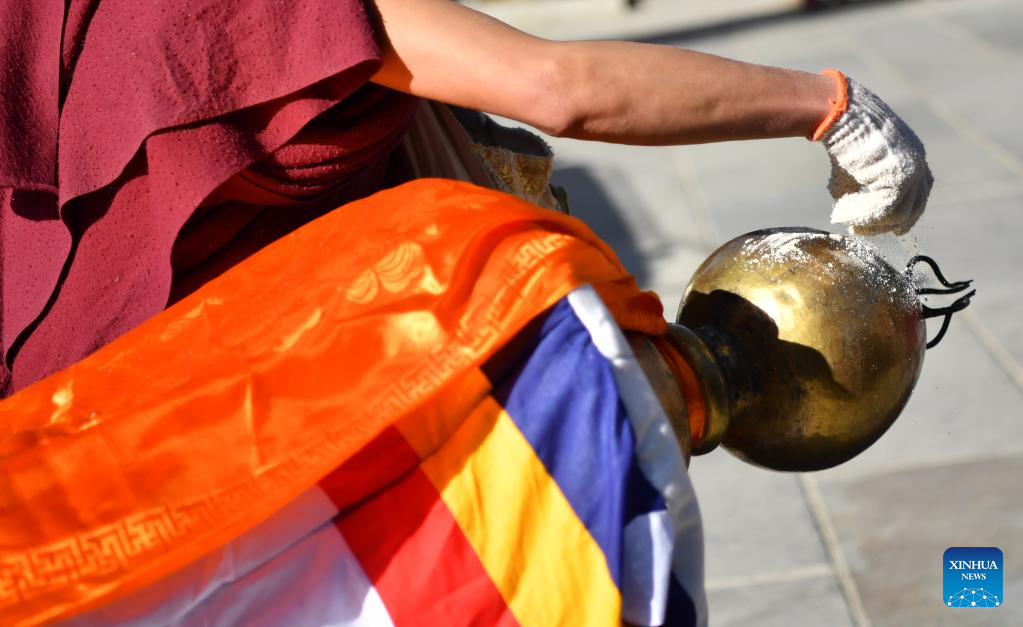 A monk performs ritual prayers during a ceremonial event at Tashilumpo Monastery in Xigaze City of southwest China's Tibet Autonomous Region, March 7, 2022. A ceremonial event was held at the monastery on Monday. (Xinhua/Chogo)