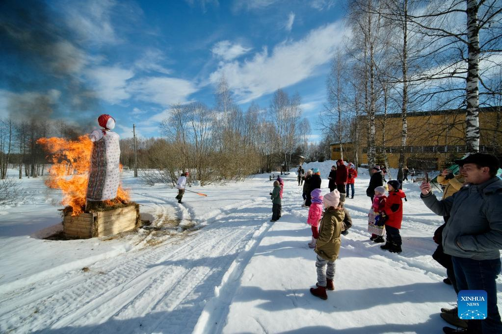 People watch a burning effigy during Maslenitsa celebrations in Gamzyuki village, Kaluga region, Russia, on March 6, 2022. Maslenitsa is a traditional holiday to celebrate the beginning of spring. (Photo by Evgeny Andreev/Xinhua)