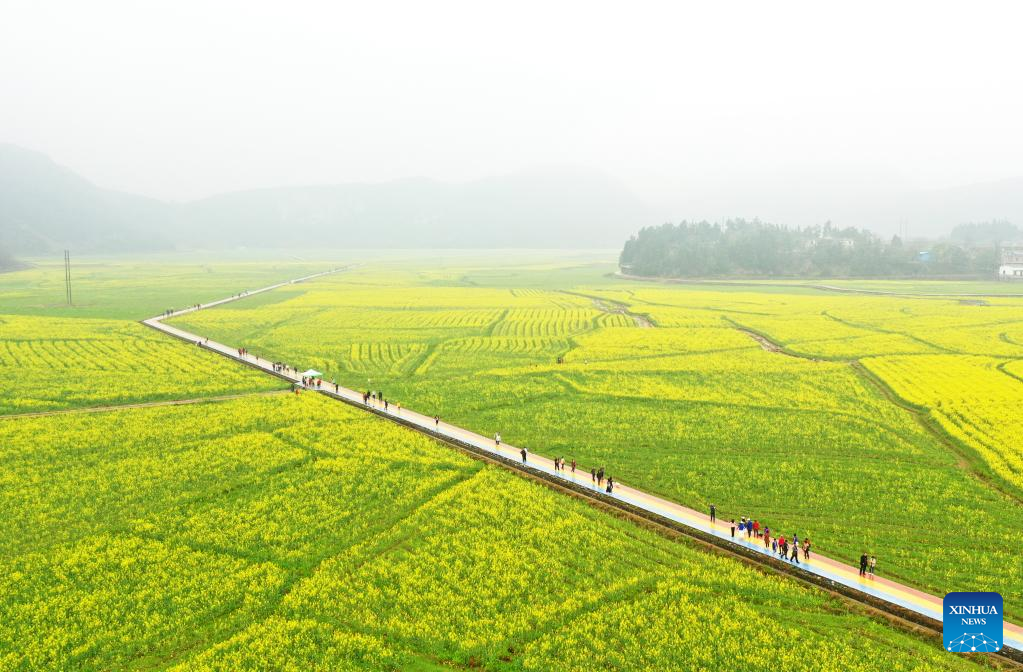 Aerial photo taken on March 6, 2022 shows cole flower fields in Panjiang Township of Guiding County, southwest China's Guizhou Province. (Photo by Yin Gang/Xinhua)