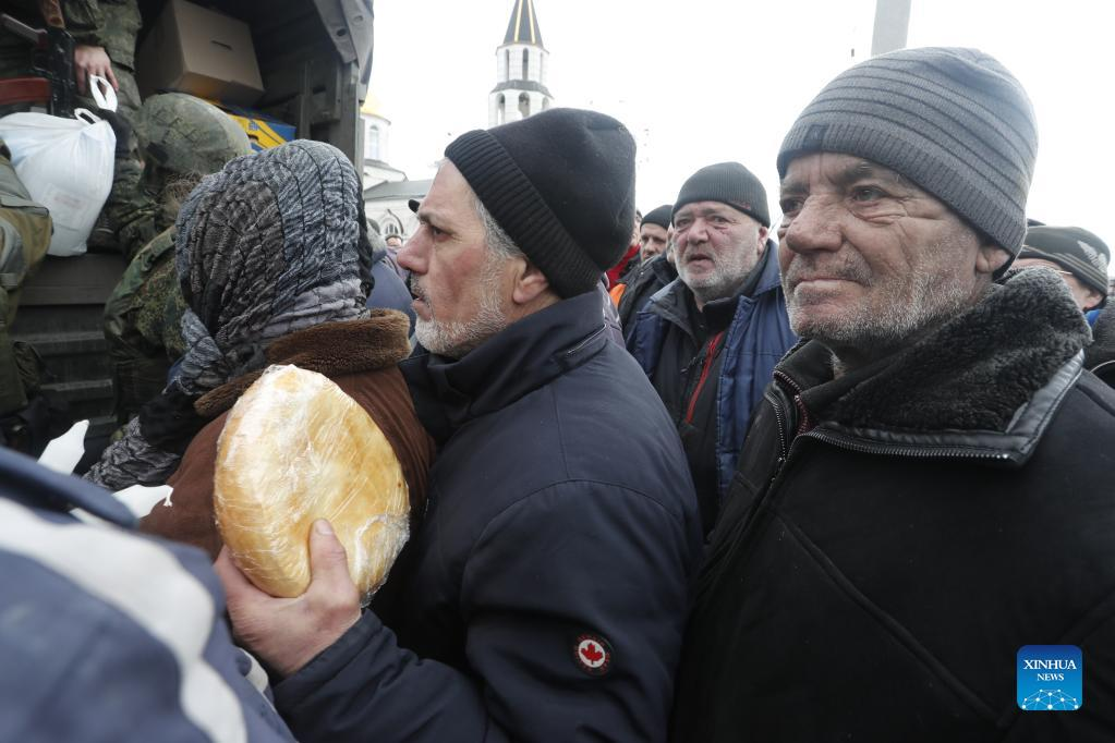 Local residents receive humanitarian aid in Donetsk on March 6, 2022. (Photo by Victor/Xinhua)