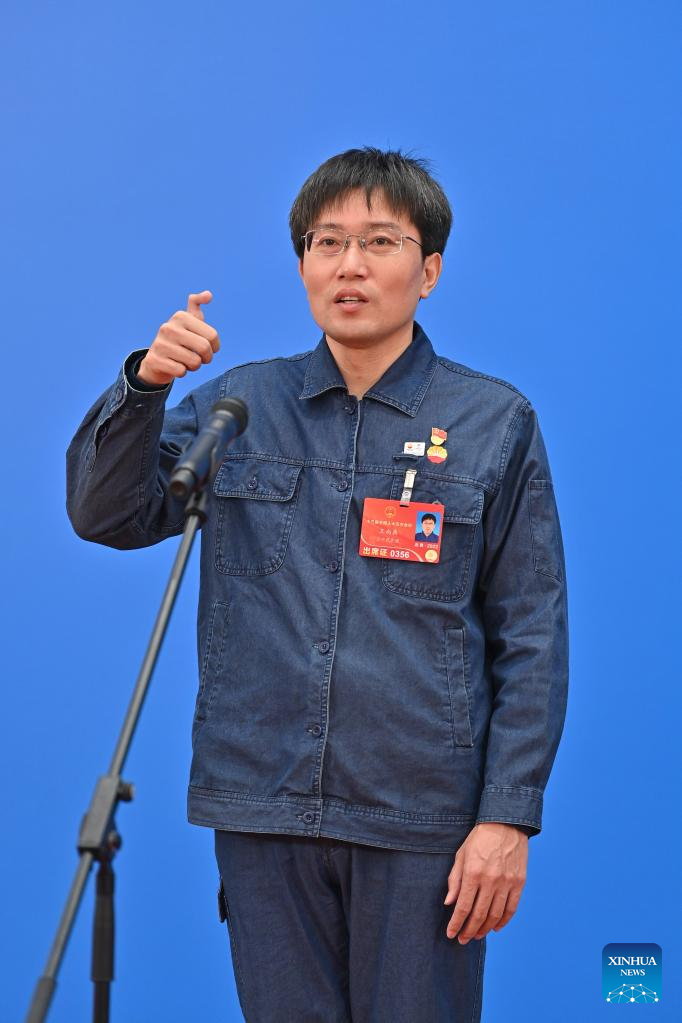 Li Hongliang, a deputy to the 13th National People's Congress (NPC), attends an interview via video link ahead of the second plenary meeting of the fifth session of the 13th NPC in Beijing, capital of China, March 8, 2022. (Xinhua/Li Xin)