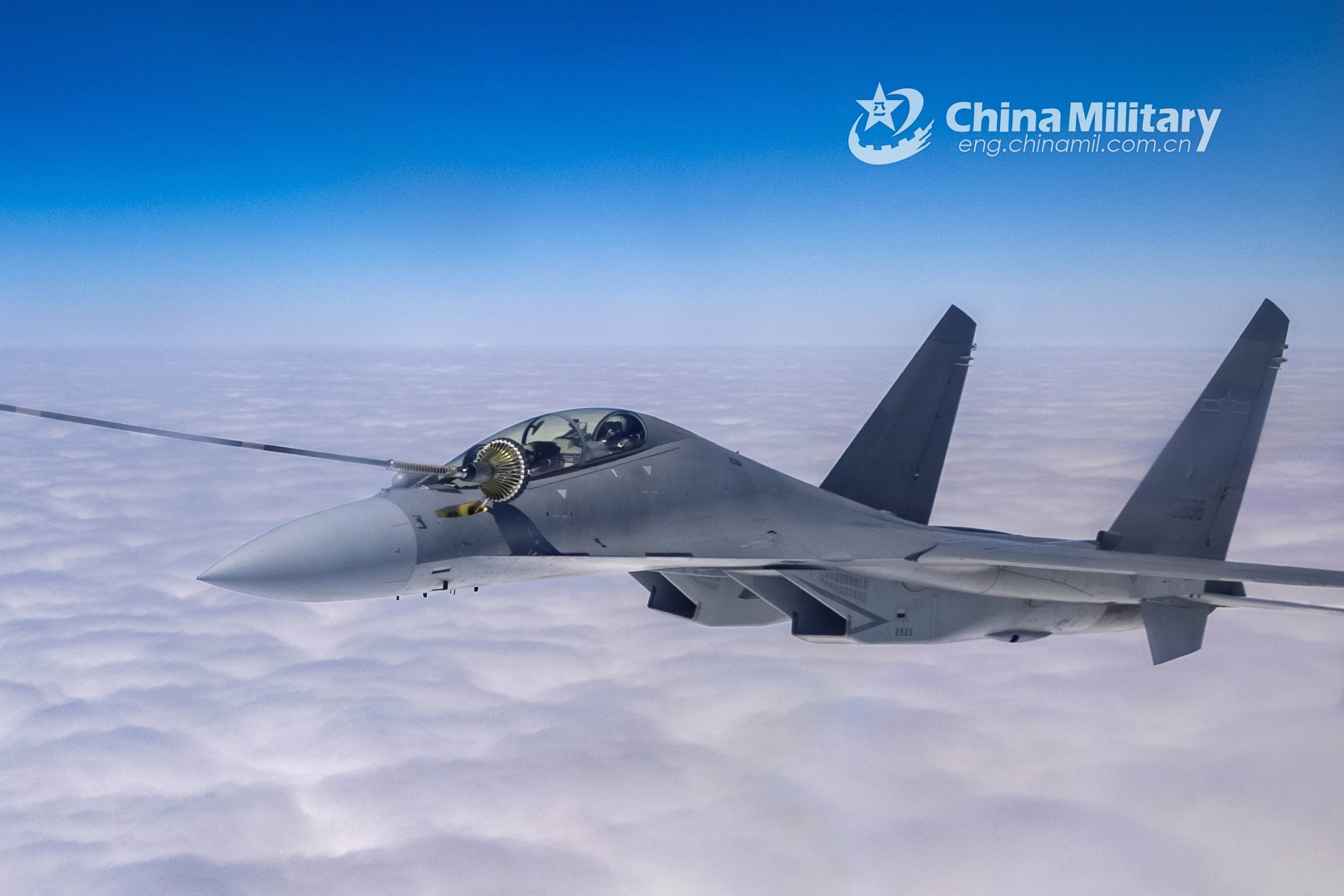 A fighter jet attached to an aviation brigade with the air force under the PLA Western Theater Command flies into position behind the refueling boom of an aircraft tanker to receive fuel during a training mission on February 20, 2022. (eng.chinamil.com.cn/Photo by Liu Chang)