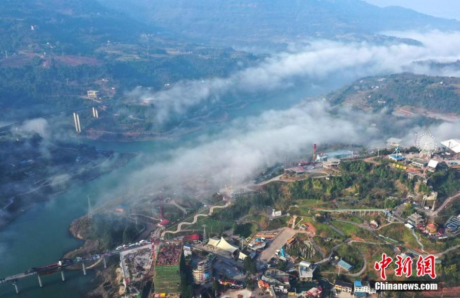 Beautiful landscape of the Wine Town shrouded in heavy advection fog near the Yangtze River in Fuling district, Chongqing, March 8, 2022. (Photo: China News Service/Yang Xiaoyong)