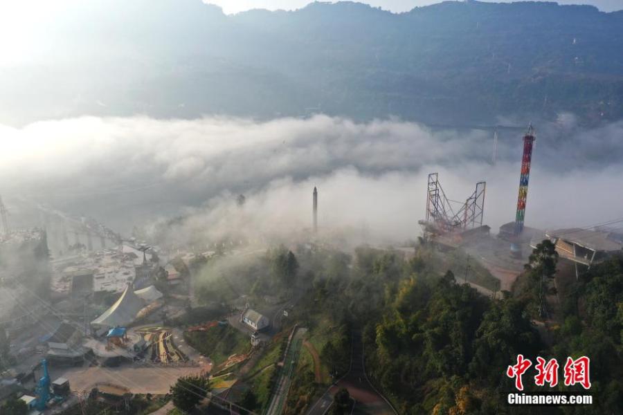 Beautiful landscape of the Wine Town shrouded in heavy advection fog near the Yangtze River in Fuling district, Chongqing, March 8, 2022. (Photo: China News Service/Yang Xiaoyong)