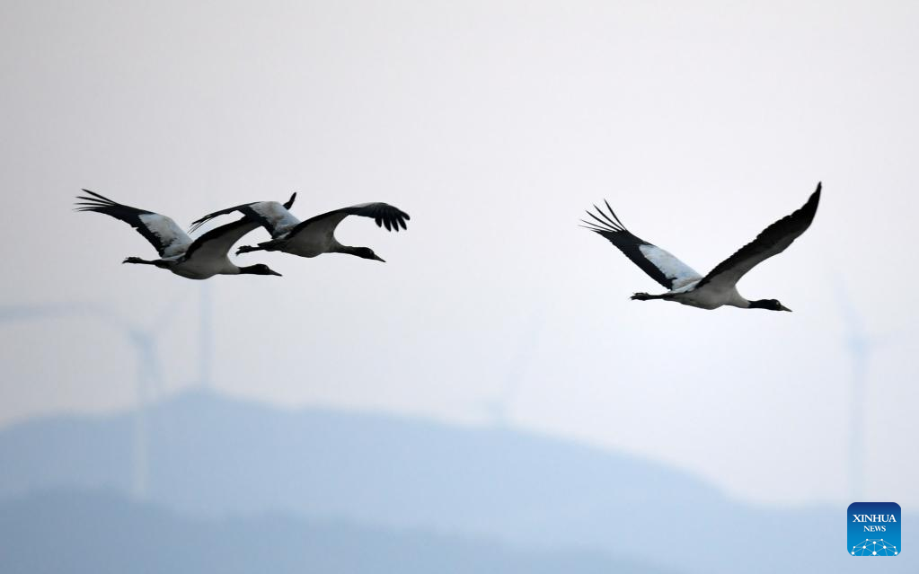 Black-necked cranes fly in the sky at the Caohai National Nature Reserve in Weining Yi, Hui and Miao Autonomous County, southwest China's Guizhou Province, March 8, 2022. (Photo by Deng Gang/Xinhua)