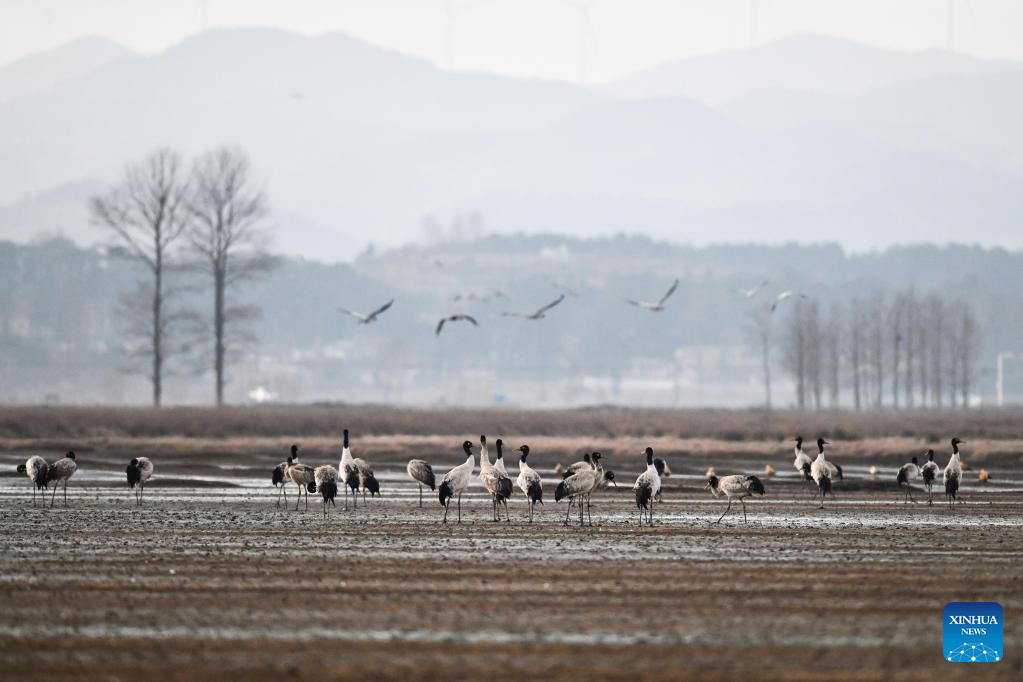 Black-necked cranes are seen at the Caohai National Nature Reserve in Weining Yi, Hui and Miao Autonomous County, southwest China's Guizhou Province, March 8, 2022. (Xinhua/Yang Wenbin)