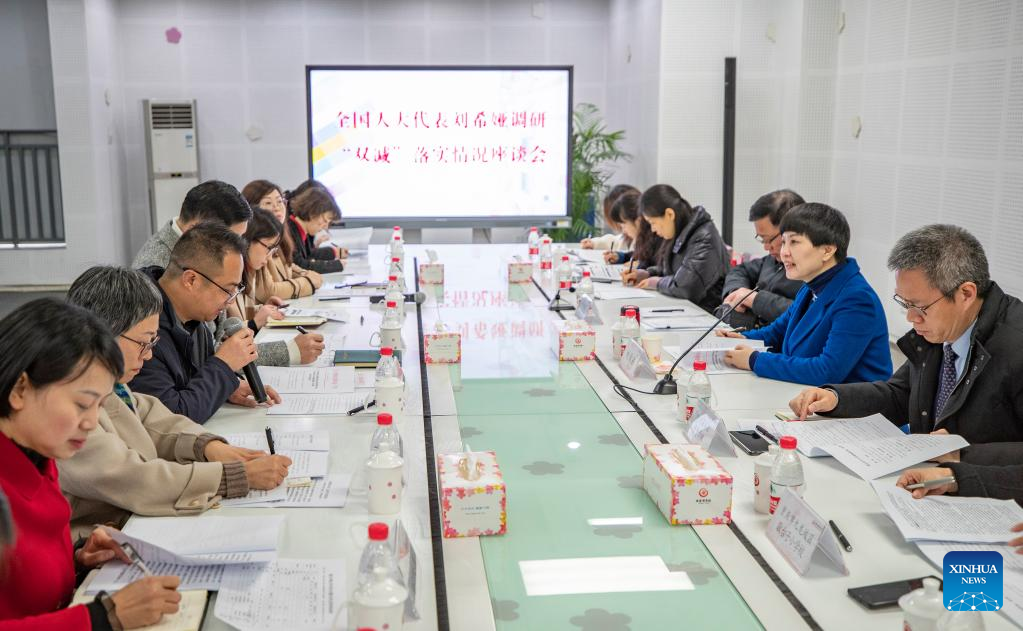 Liu Xiya (2nd R) seeks suggestions on the implementation of China's "double reduction" policy from representatives of school staff and education authorities at Xiejiawan Primary School in southwest China's Chongqing, Feb. 24, 2022.
