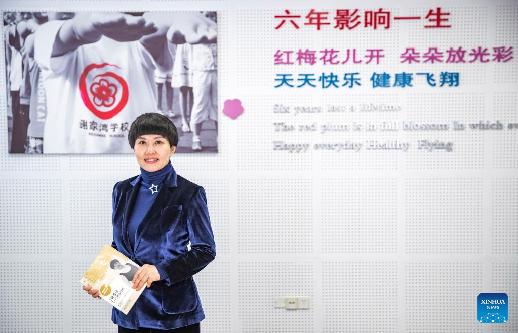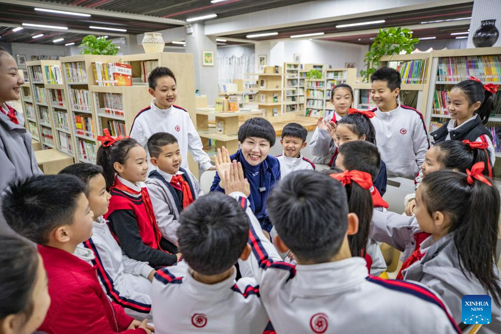 Liu Xiya (C) interacts with students to welcome the new semester at Xiejiawan Primary School in southwest China's Chongqing, Feb. 24, 2022.