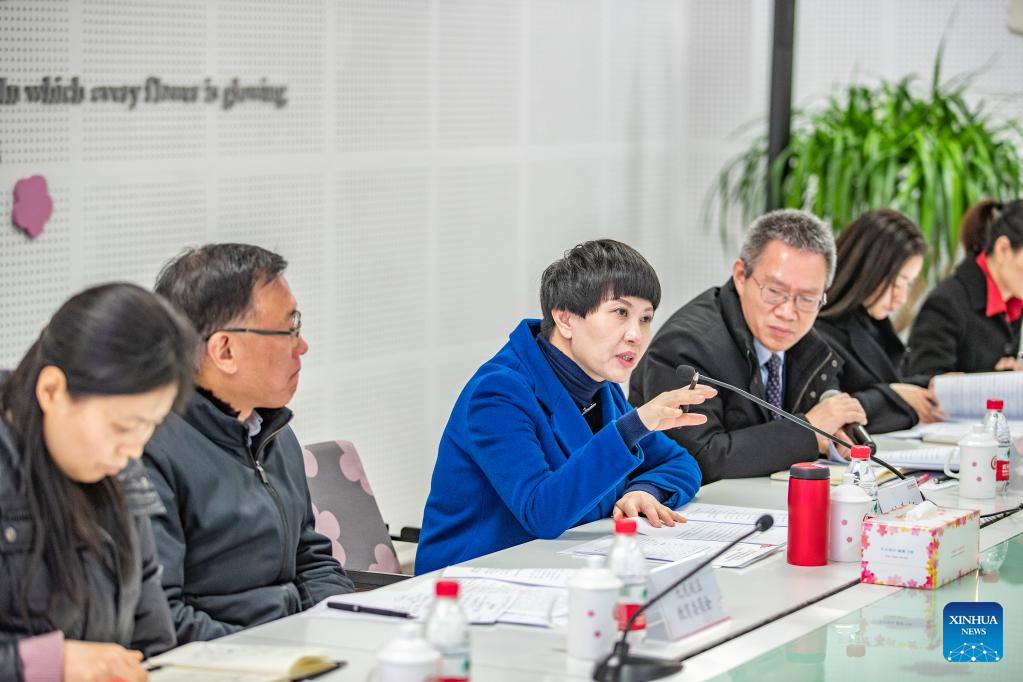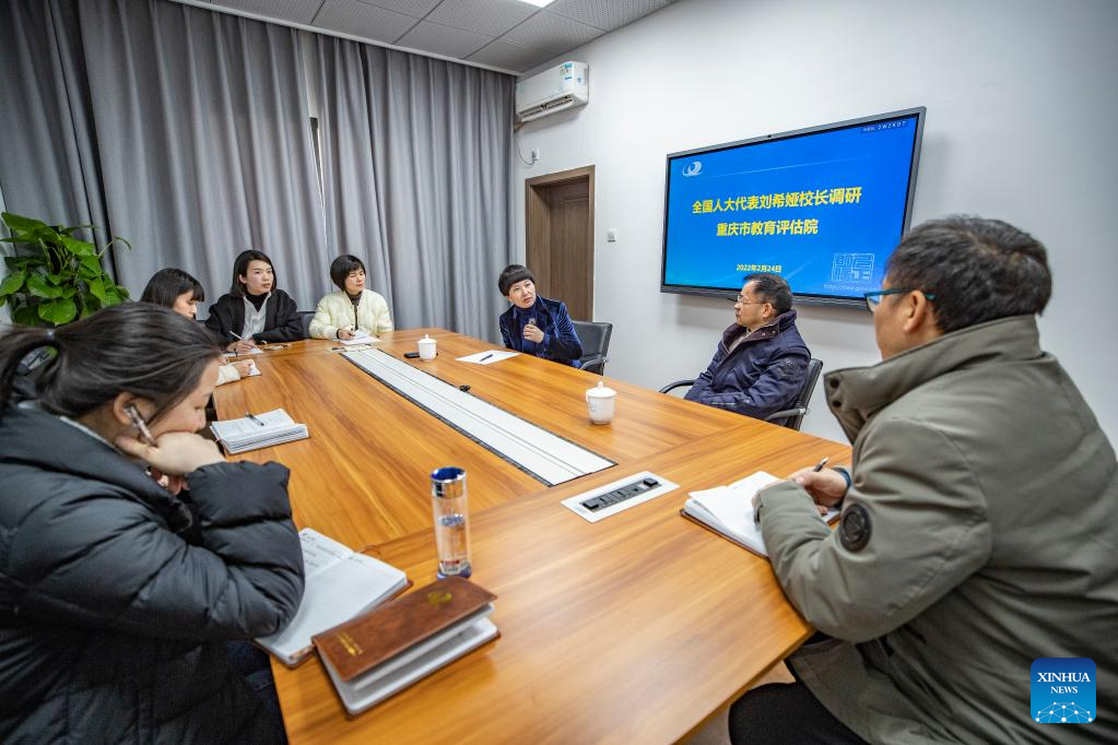 Liu Xiya (3rd R) collects suggestions on the reform of education evaluation system under China's "double reduction" policy framework from staffers of Chongqing Educational Evaluation Institute in southwest China's Chongqing, Feb. 24, 2022.