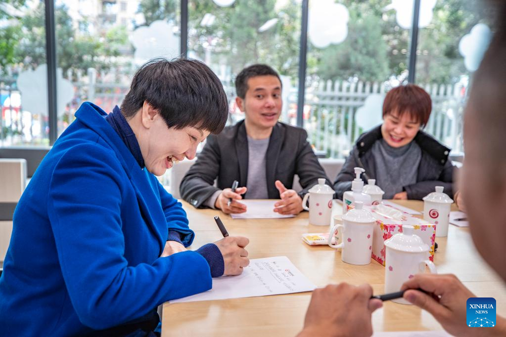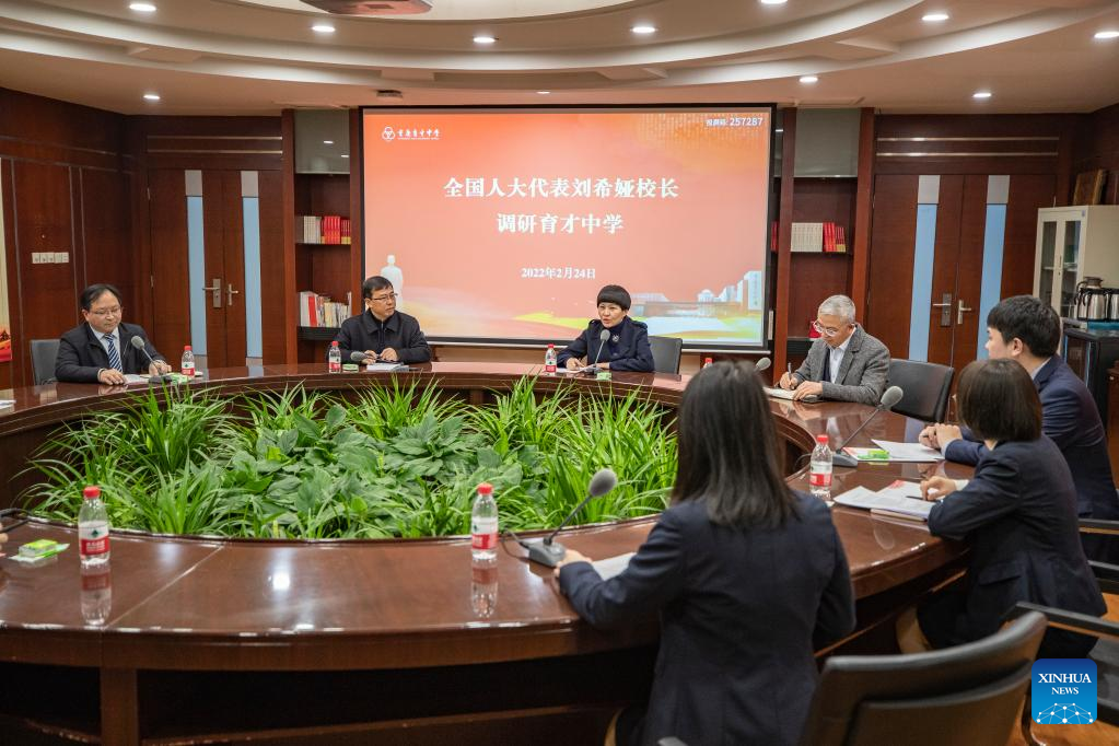 Liu Xiya (3rd L) seeks suggestions on the implementation of China's "double reduction" policy from representatives of teaching staff at Yucai Middle School in southwest China's Chongqing, Feb. 24, 2022.