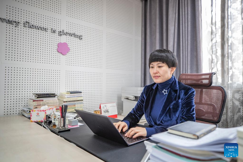 Liu Xiya works at her office at Xiejiawan Primary School in southwest China's Chongqing, Feb. 24, 2022.
