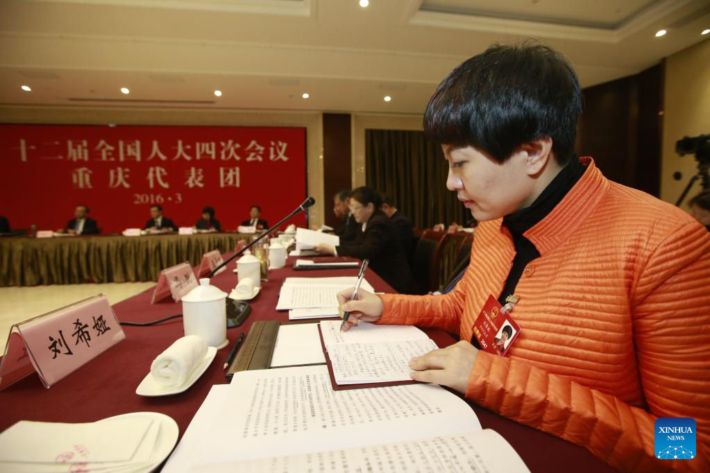 Liu Xiya (1st R) takes notes while attending deliberation with other deputies from Chongqing at the fourth session of the 12th National People's Congress in Beijing, capital of China, March 5, 2016.
