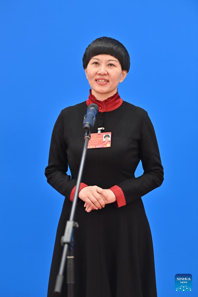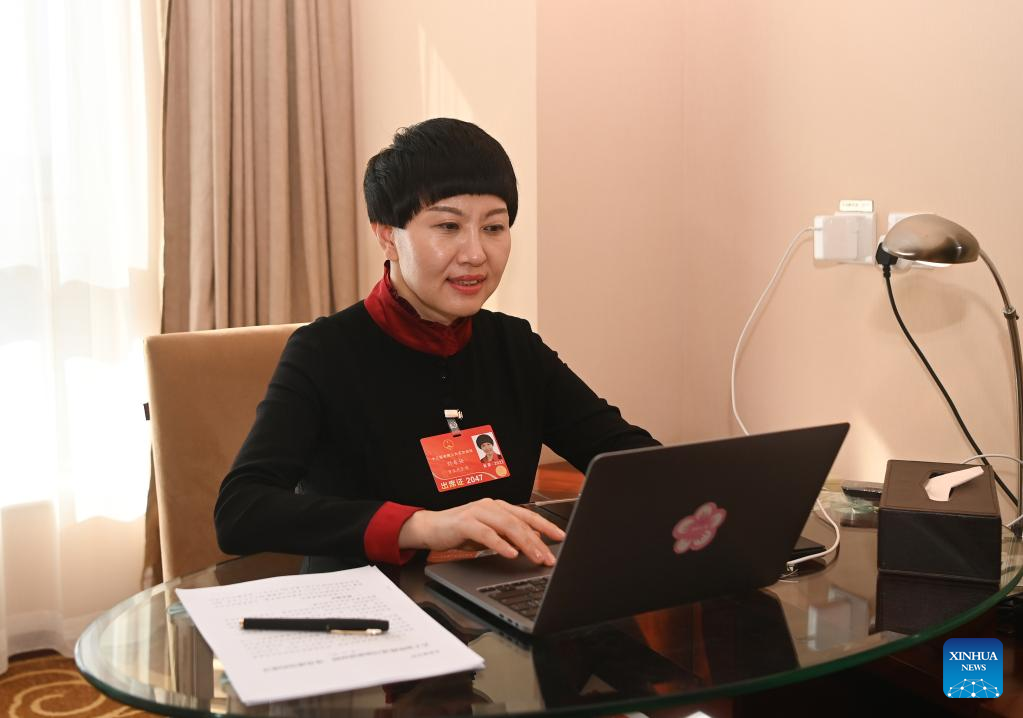 Liu Xiya, a deputy to the 13th National People's Congress (NPC), attends an interview via video link ahead of the second plenary meeting of the fifth session of the 13th NPC in Beijing, capital of China, March 8, 2022.