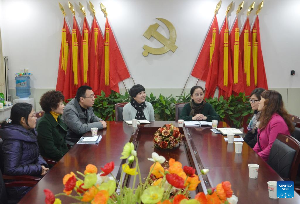 Liu Xiya (3rd L) seeks suggestions on the implementation of China's "double reduction" policy from representatives of school staff and education authorities at Xiejiawan Primary School in southwest China's Chongqing, Feb. 24, 2022.