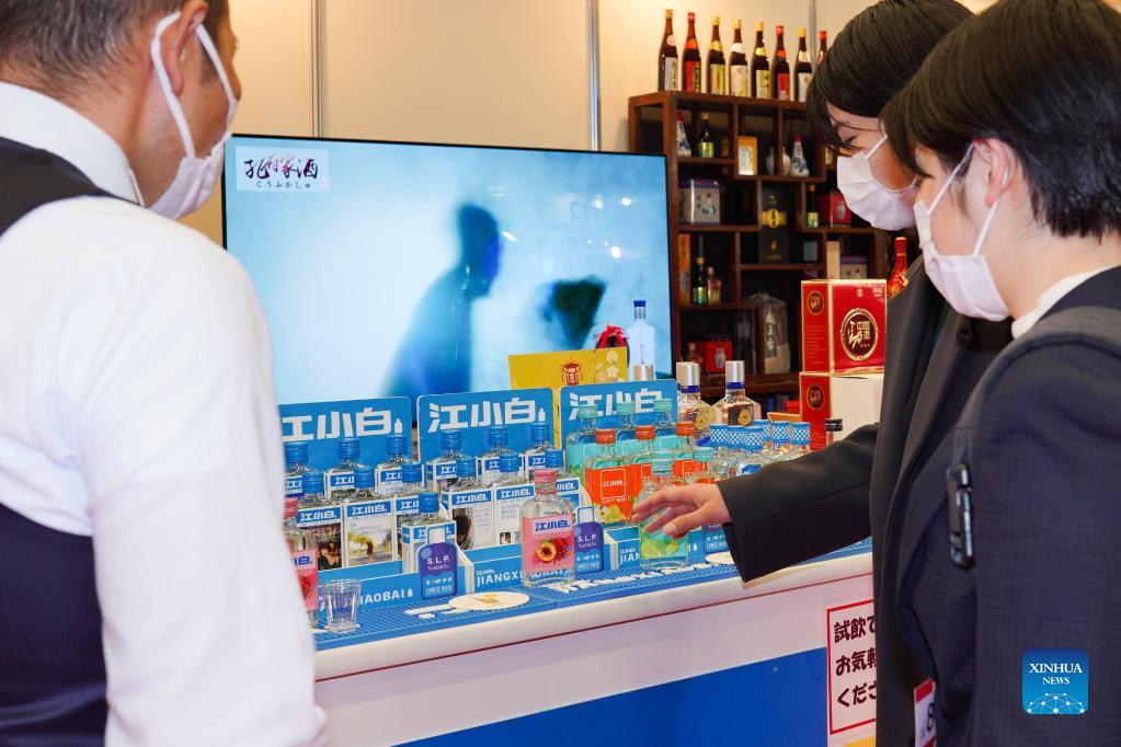 People visit a stall displaying Chinese liquor during the 47th International Food and Beverage Exhibition at the Makuhari Messe International Exhibition Hall in Chiba, Japan, March 8, 2022. The exhibition is held from March 8 to March 11. Nearly 1,500 companies from 44 countries and regions participated in the exhibition. (Xinhua/Zhang Xiaoyu)