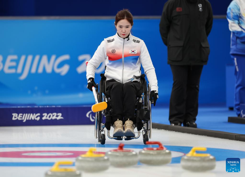Jang Jaehyuk (2nd R) of South Korea competes during the Wheelchair Curling Round Robin Match between South Korea and Canada of Beijing 2022 Winter Paralympics at National Aquatics Center in Beijing, capital of China, on March 8, 2022. (Xinhua/Wu Huiwo)