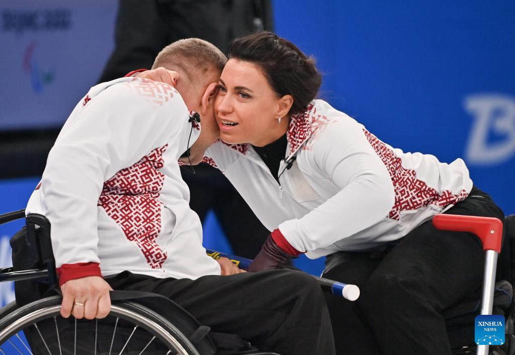 Ronny Persson (L) and Kristina Ulander of Sweden react during the Wheelchair Curling Round Robin Match between Sweden and Estonia of Beijing 2022 Winter Paralympics at National Aquatics Center in Beijing, capital of China, on March 8, 2022. (Xinhua/Zhang Keren)