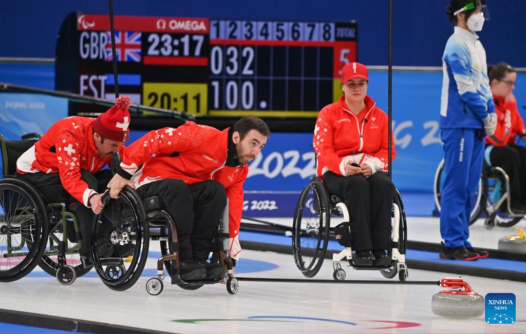 Laurent Kneubuehl (2nd L) of Switzerland competes during the Wheelchair Curling Round Robin Match between Switzerland and Latvia of Beijing 2022 Winter Paralympics at National Aquatics Center in Beijing, capital of China, on March 8, 2022. (Xinhua/Wu Huiwo)