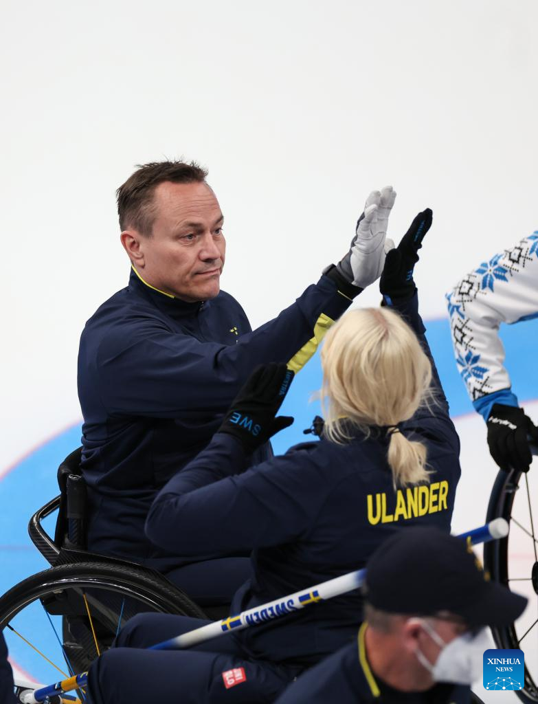 Team members of Sweden react during the Wheelchair Curling Round Robin Match between Sweden and Estonia of Beijing 2022 Winter Paralympics at National Aquatics Center in Beijing, capital of China, on March 8, 2022. (Xinhua/Zhang Keren)