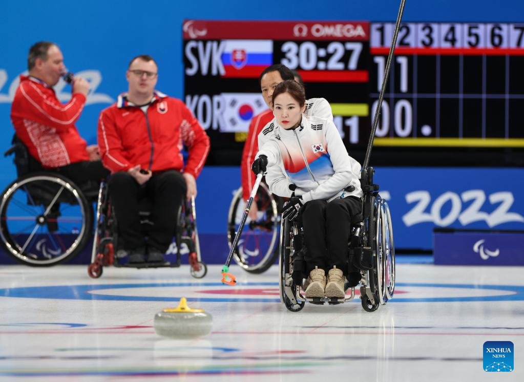 Baek Hyejin (front) of South Korea competes during the Wheelchair Curling Round Robin Match between Slovakia and South Korea of Beijing 2022 Winter Paralympics at National Aquatics Center in Beijing, capital of China, on March 8, 2022. (Xinhua/Zhang Keren)