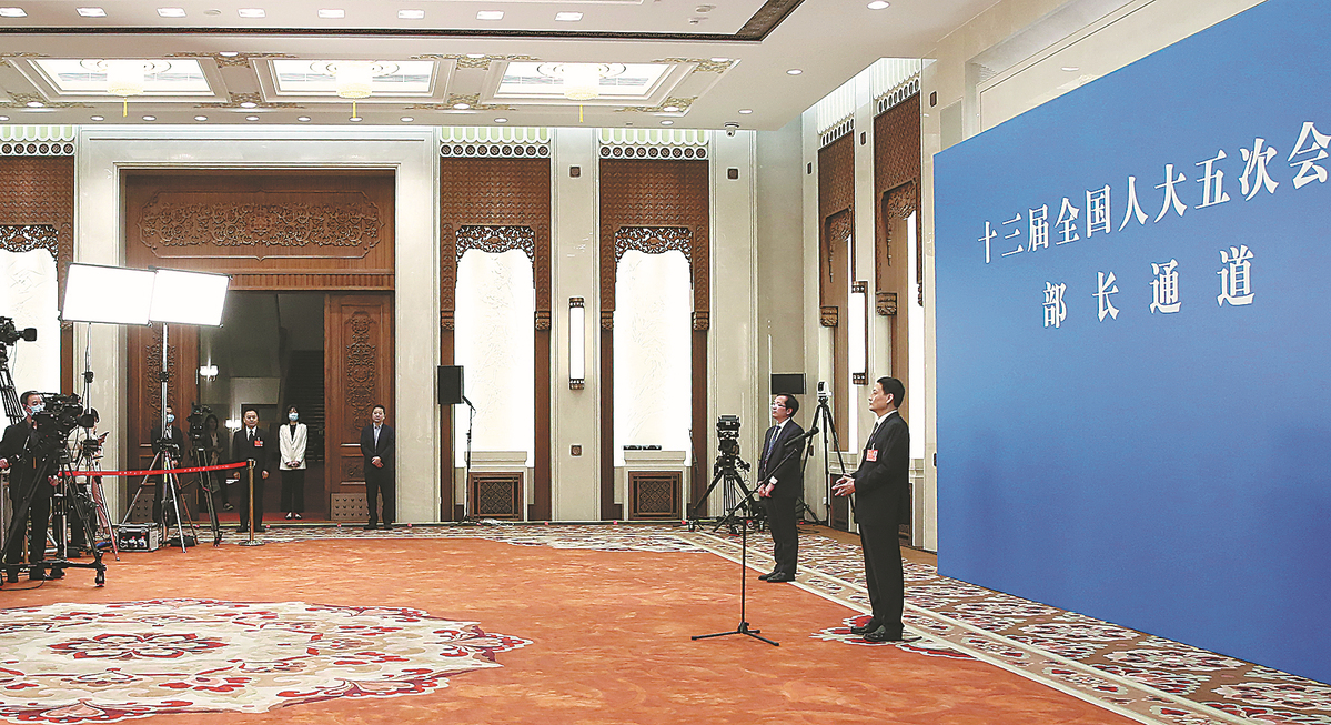 Xiao Yaqing (right), minister of industry and information technology, interacts with the media via video in Beijing on Wednesday. [Photo by Wang Jing/China Daily]