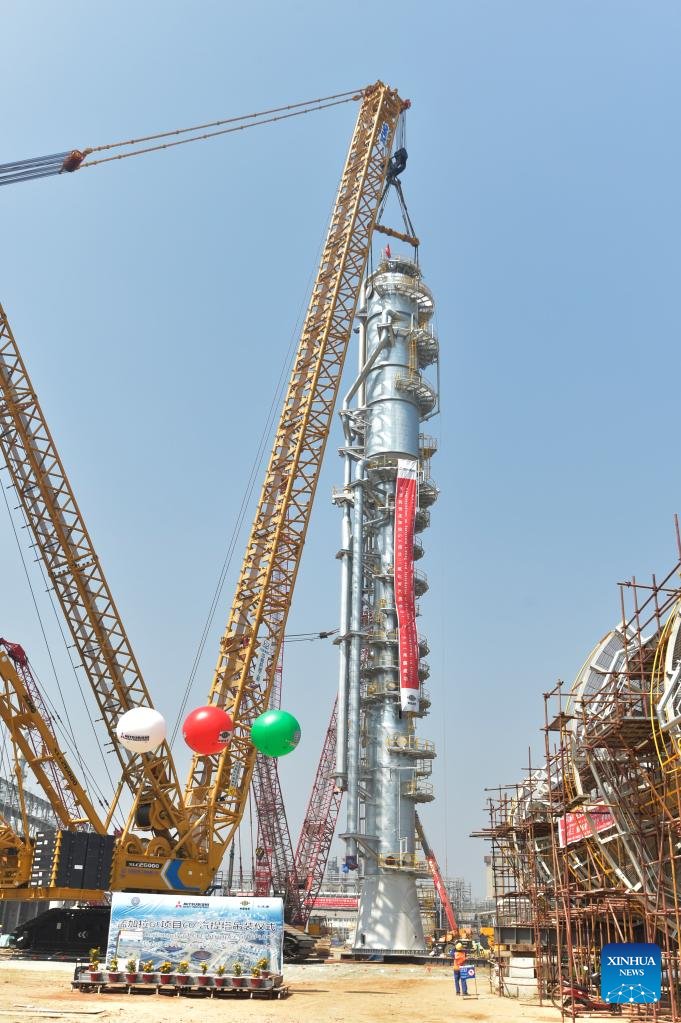 A carbon dioxide stripper tower is installed at a fertilizer plant under construction in Narsingdi, Bangladesh, on March 8, 2022. The carbon dioxide stripping tower, the first super-heavy equipment of Bangladesh's Ghorashal-Polash Urea fertilizer project (GPUFP), the country's largest and first ever green fertilizer factory, was installed successfully on Tuesday. Engineers and workers from China National Chemical Engineering &Construction Corporation Seven Ltd successfully lifted and installed the tower, which is 68.5 meters high and has a self-weight of 447.5 tons. (Xinhua)