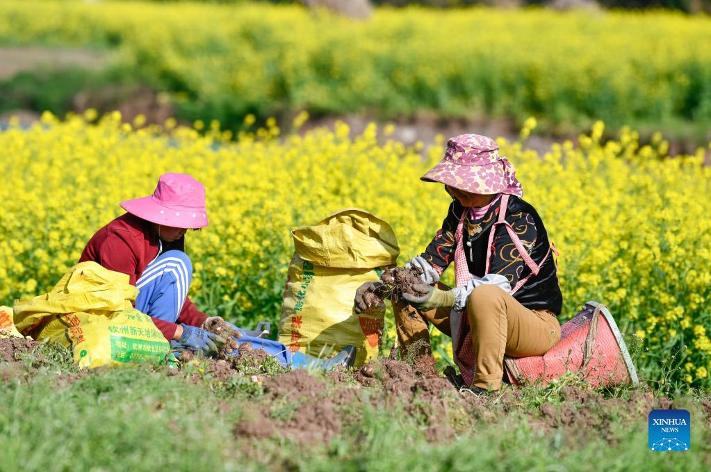 Farmers work in the fields in Weining, southwest China's Guizhou Province, March 8, 2022. In the process of consolidating poverty alleviation achievements and promoting rural revitalization, Guizhou has actively guided farmers to change farming methods and develop suitable agriculture industry in mountainous areas. At the same time, Guizhou made efforts to integrate agriculture with tourism and cultural industries, which helped to increase agricultural efficiency and farmers' income. (Xinhua/Yang Wenbin)