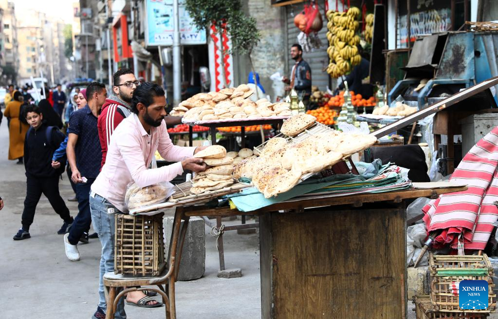 A vendor arranges bread for sale at a market in Cairo, Egypt, on March 9, 2022. Egyptian Prime Minister Mostafa Madbouly on Wednesday pledged to keep food prices in the fair range amid the ongoing conflict between Russia and Ukraine. (Xinhua/Ahmed Gomaa)