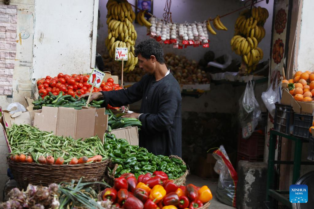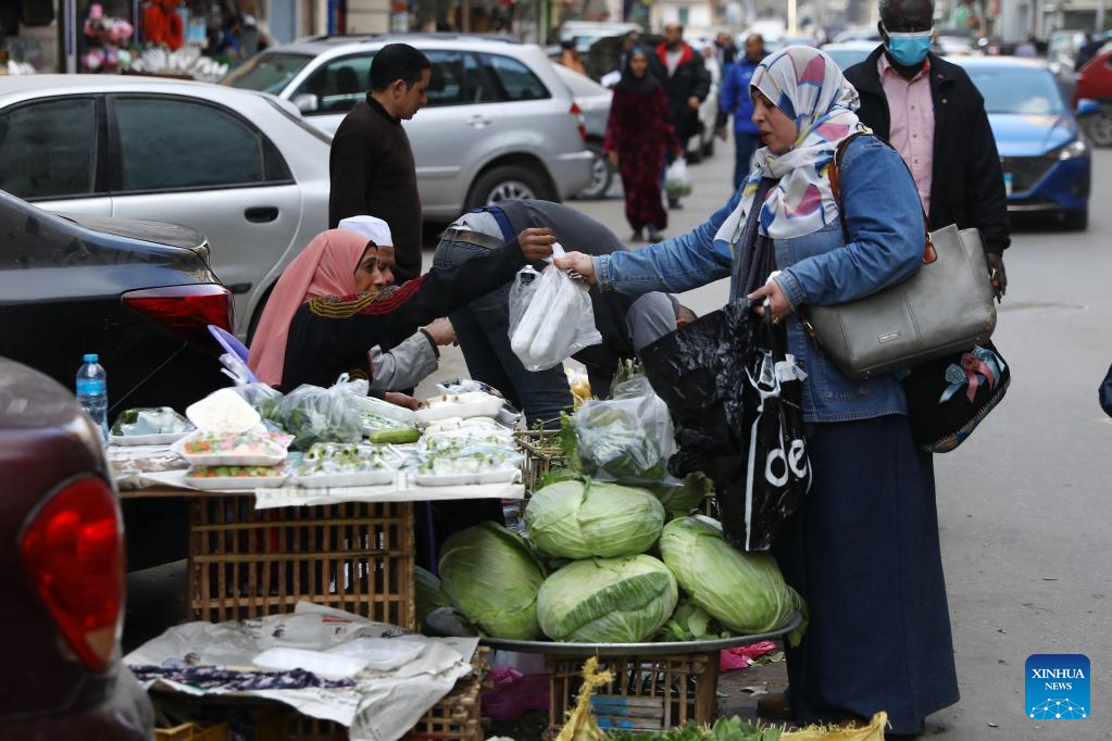 Vendors sell vegetables at a market in Cairo, Egypt, on March 9, 2022. Egyptian Prime Minister Mostafa Madbouly on Wednesday pledged to keep food prices in the fair range amid the ongoing conflict between Russia and Ukraine. (Xinhua/Ahmed Gomaa)