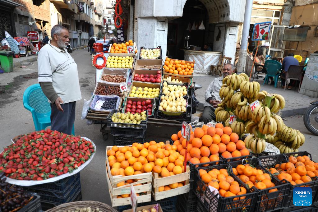 People sell fruit at a market in Cairo, Egypt, on March 9, 2022. Egyptian Prime Minister Mostafa Madbouly on Wednesday pledged to keep food prices in the fair range amid the ongoing conflict between Russia and Ukraine. (Xinhua/Ahmed Gomaa)