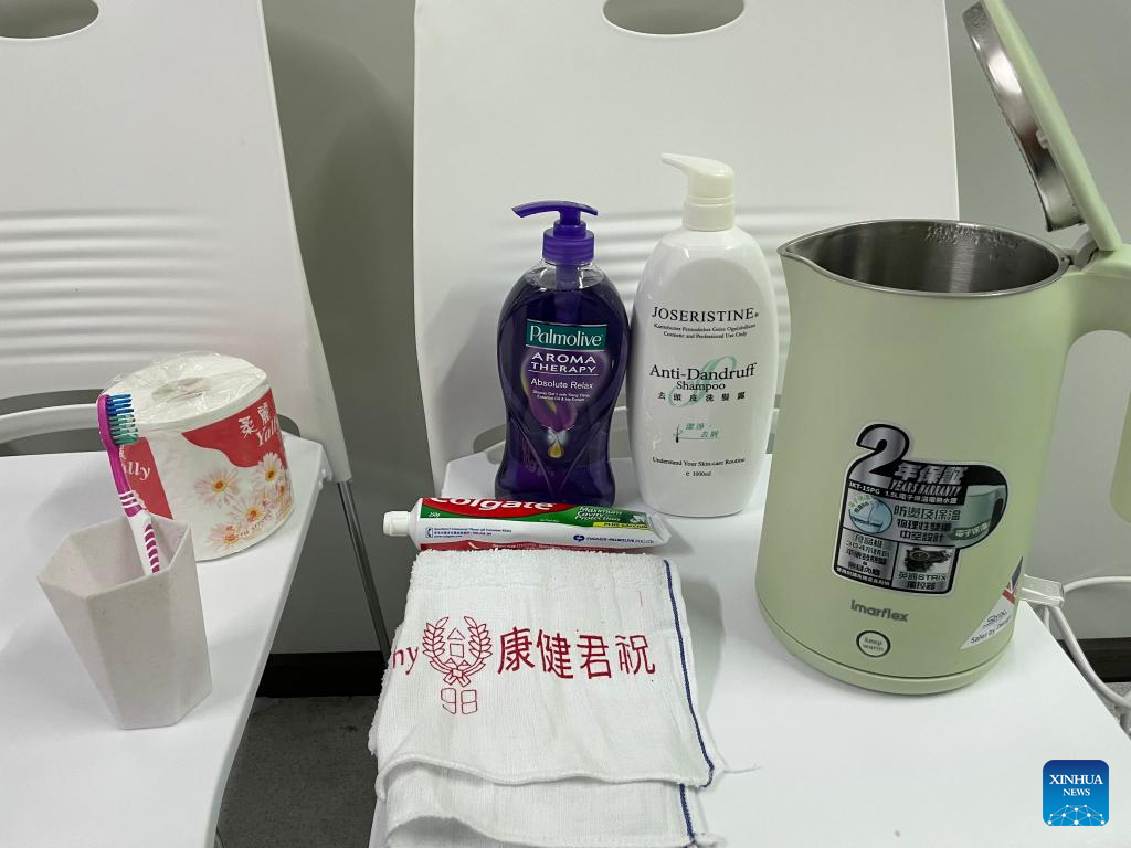 Photo taken with a mobile phone shows the toiletries provided to every patient in a community isolation facility (CIF) in Tsing Yi, south China's Hong Kong, on March 9, 2022. (Xinhua)