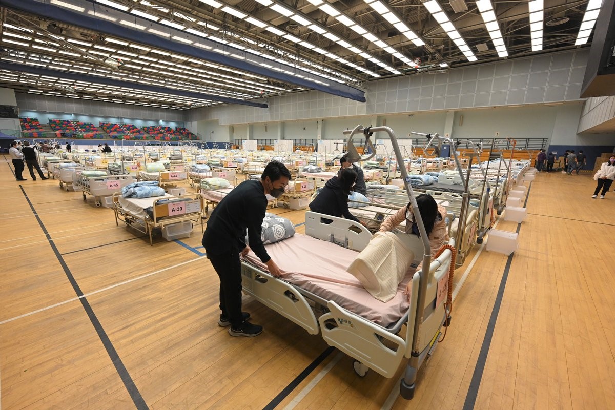 Photo shows a center established by the Social Welfare Department of Hong Kong at the Shek Kip Mei Park Sports Centre for taking care of elderly COVID-19 patients with mild symptoms. It was put into operation on March 1. (Photo/new.gov.hk)