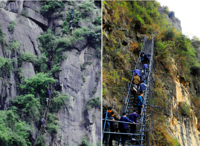 The comparison of two photos shows the change from a ratten ladder from the steep cliffs to a steel radder replacement in Zhaojue county, Sichuan's Liangshan Yi Autonomous Prefecture.